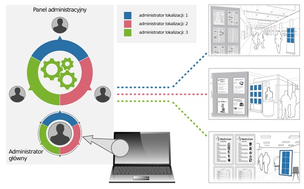 Panel administracyjny umożliwia zmianę treści i ustawień masowo dla ekranów w poszczególnych grupach lub osobno dla każdego ekranu niezależnie.